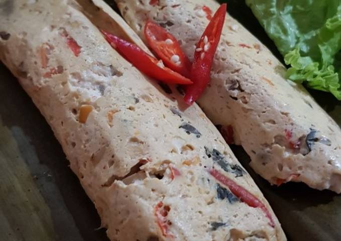 - Letakkan adonan tahu yg telah halus pada daun pisang yg telah dibersihkan, lalu lipat dan jepit dengan tusukan.. bisa juga dimasukkan dalam wadah pyrex seluruhnya.