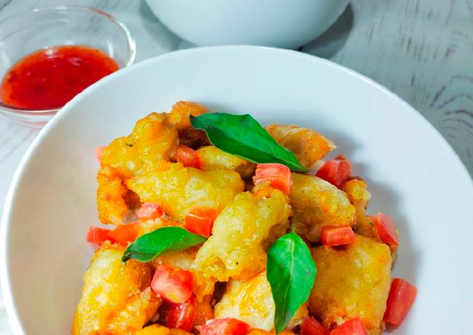 - Masukkan Potongan Ayam fillet ke mangkuk, lalu taburi dengan tepung maizena, garam & petikkan daun kemangi, aduk- aduk hingga bahan merata dengan potongan Ayam, kemudian potongan ayam fillet yang telah dilapisi diamkan selama 15 menit agar bumbu meresap pada ayam.