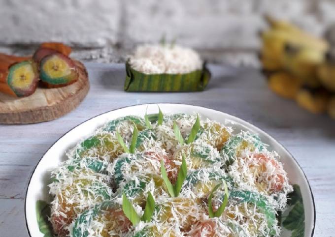 - Sediakan 50 gram kelapa parut memanjang, beri sedikit garam, kukus.