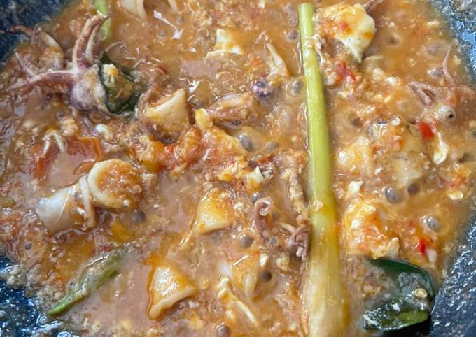 - Jika air mulai menyurut, masukkan potongan tomat, dan tunggu hingga cumi matang.