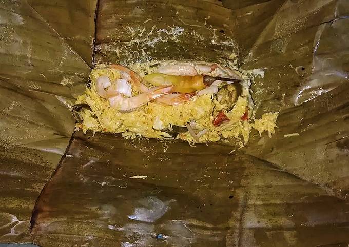 - Jika semua sudah siap, masukkan campuran bahan (no 5) dengan udang. Tambahkan cabe rawit di atas botok kemudian bungkus dengan daun pisang.