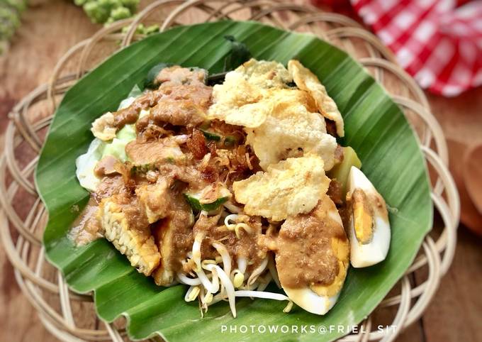 - Rebus sayur2an asal layu. Lalu tata sayur, tempe, telur diatas piring. Siram dg saus gado2, taburi dg bawang goreng dan emping/kerupuk.