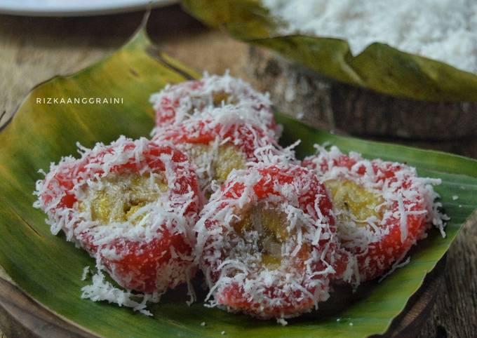 - Parut singkong, peras airnya. Beri gula, sedikit garam, aduk rata. Tambahkan sedikit pewarna aduk rata..