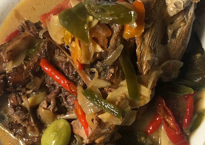 - Masukkan santan dan semua bumbu2 lain, didihkan. Masukkan kepala ikan Manyung dan pete. Cicipi rasanya.