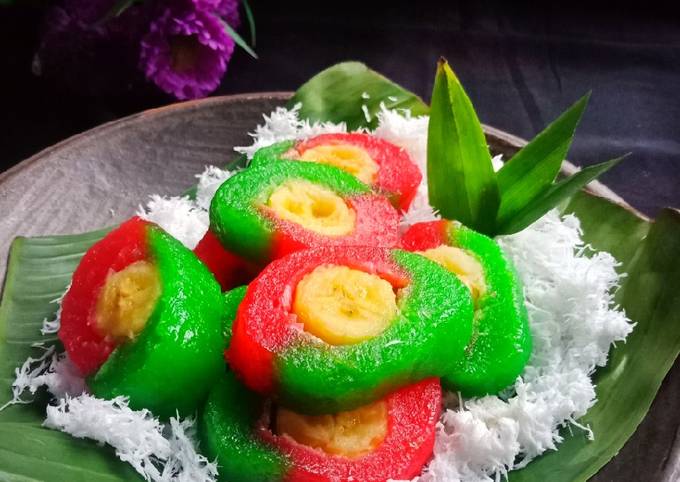 - Ambil daun yang telah dibersihkan oles tipis dengan minyak goreng. Ambil 2 sdm adonan warna merah & 2 sdm warna hijau ratakan. Taruh pisang ditengah lalu gulung dan semat dengan lidi/tusuk gigi. Lakukan hingga adonan habis. Saya jadi 4 bungkus.