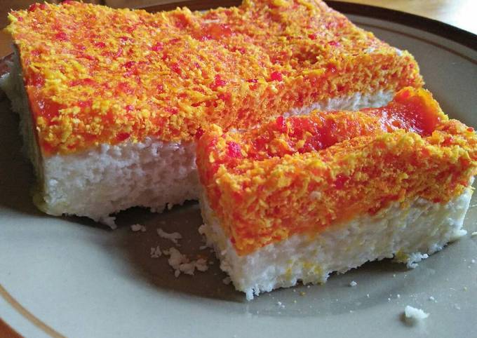 - Siapkan loyang, masukkan adonan putih dan adonan warna diatasnya.