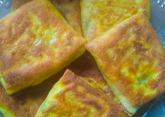 - Ambil satu bulatan adonan pipihkan setipis mungkin lalu letakkan diatas teflon yang sudah diolesi margarin.ambil satu sendok makan isian taroh diatasnya lalu lipat masak dengan api sedang hingga kuning keemasan..