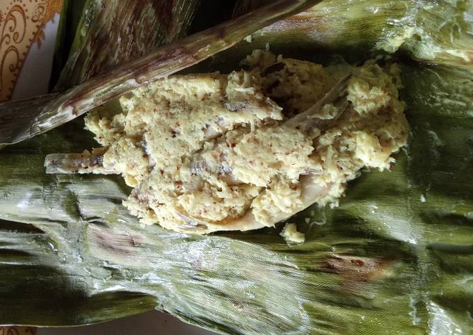 - Bungkus adonan dengan daun pisang..