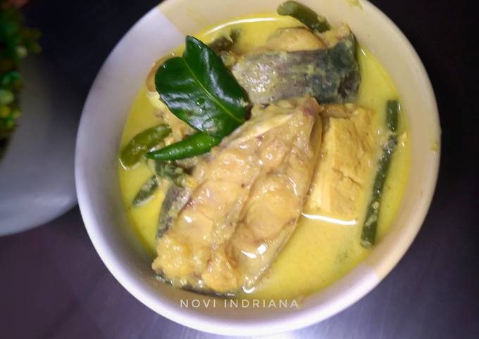 - Marinasi ikan terlebih dahulu kurleb 15 menit. Haluskan bumbu. Boleh diblender. Masukkan dalam wajan. Tambahkan daun jeruk dan daun kunyit. Tambahkan santan encer. Panaskan api. Masukkan tahu. Masak hingga mendidih..