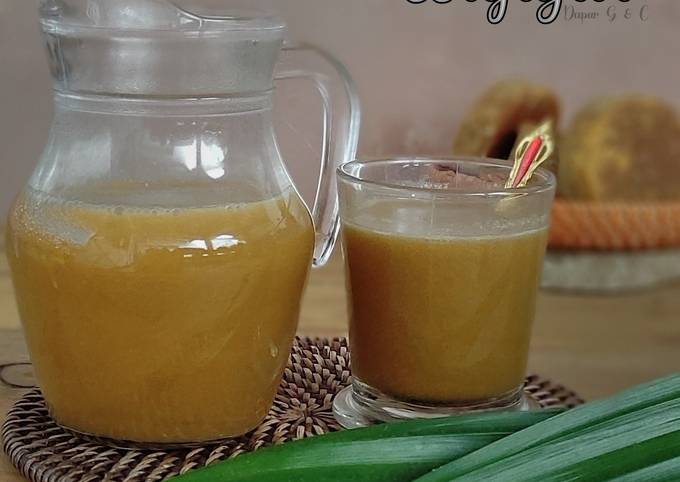 - Panaskan air, tambahkan jahe, gula merah, daun pandan, kopi dan serai.