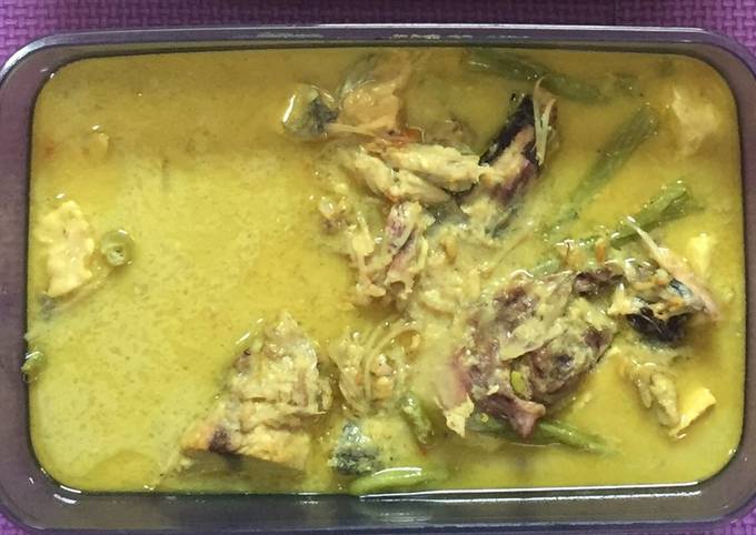 - Setelah mateng keluarkan ikannya, biarkan air kaldunya lalu tambahkan santan dan bumbu yg sudah dihaluskan (bawang putih+bawang merah+jahe+lengkuas+kunyit+cabe rawit merah) serta daun jeruk, daun salam sere dan asam kandis..