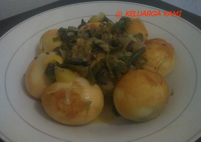 - Masukkan telur goreng, masak sampai air menyusut dan bumbu meresap.